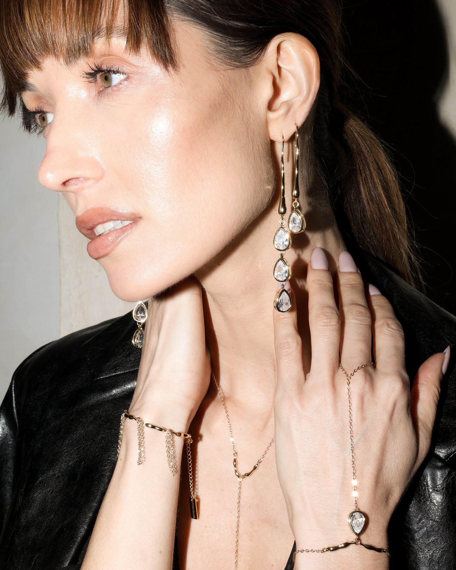 The collection introduces the drop necklace the brand is known for, alongside lariat pieces, earrings, and hand harnesses built around the same motif. Each design is assembled with fine gold-filled chains that trace the wrist, collarbone, and hand, creating small points of light as you move.