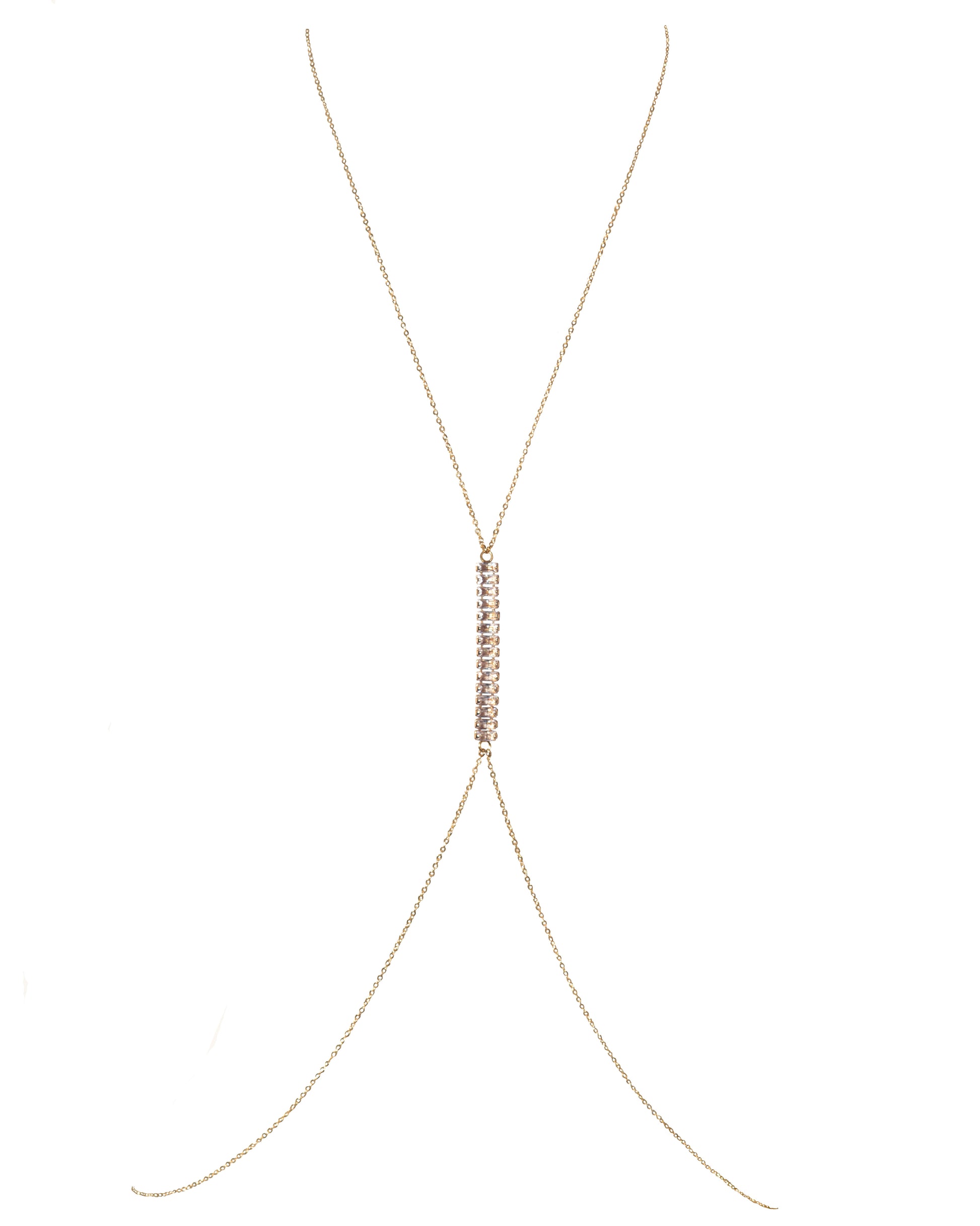 Axis is a body chain designed as a vertical statement of power. Anchored by a handset pavé bar and draped in 14k gold-filled chains, it follows the body’s centerline—highlighting the chest and waist with intentional symmetry. The silhouette is bold, architectural, and quietly commanding.