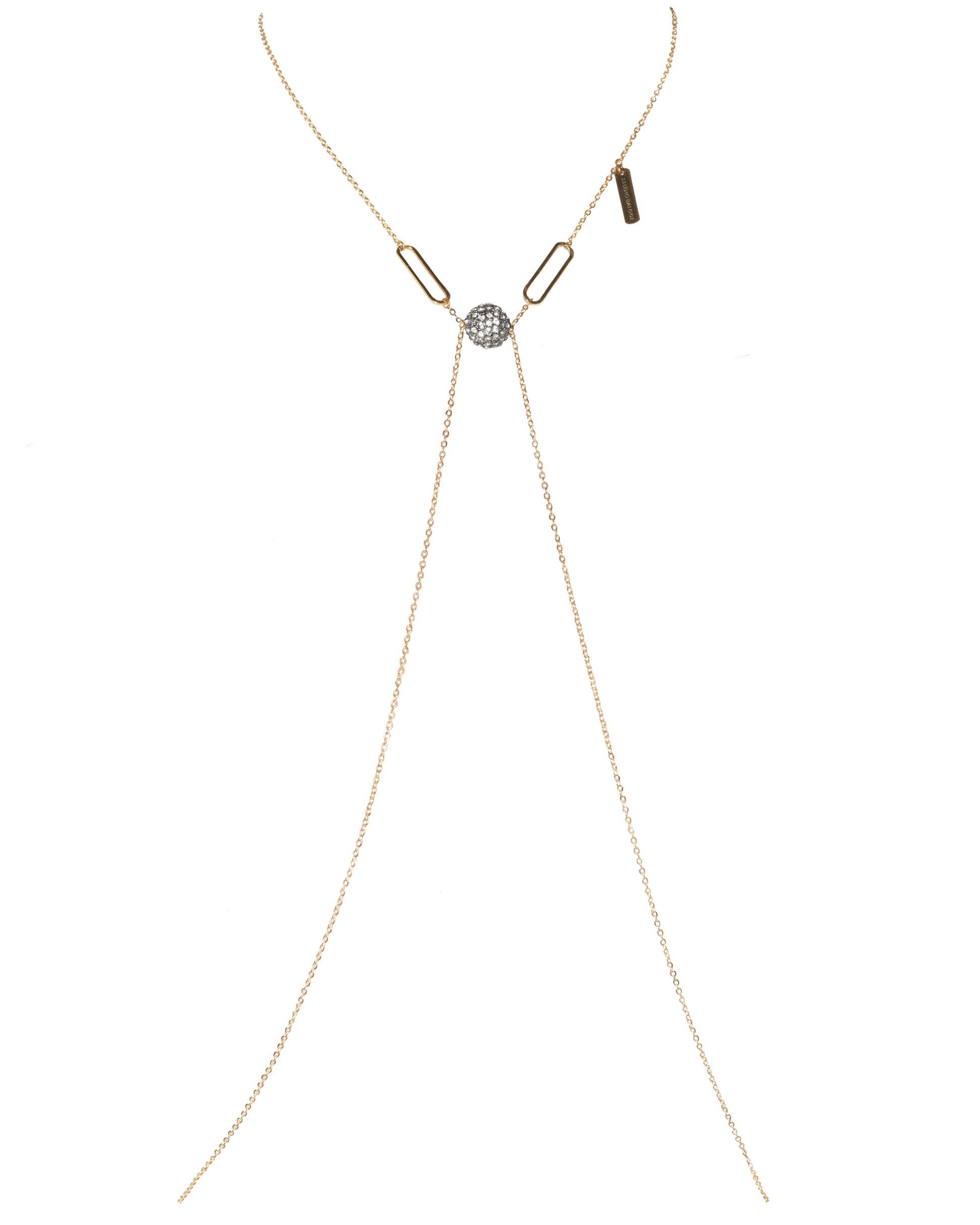 Crafted to contour, the Aziza Body Chain sits just beneath the bust—where softness meets symmetry. This 14k gold-filled design features a single pavé bead at the center, catching light with quiet precision.
