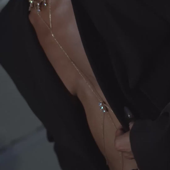 A study in light and form, the Éclat Body Chain is designed to move like a second skin. Each line of 14k gold-filled chain catches the light in subtle arcs, anchored by our signature faceted crystal accents—a quiet spark that suggests more than it shows.