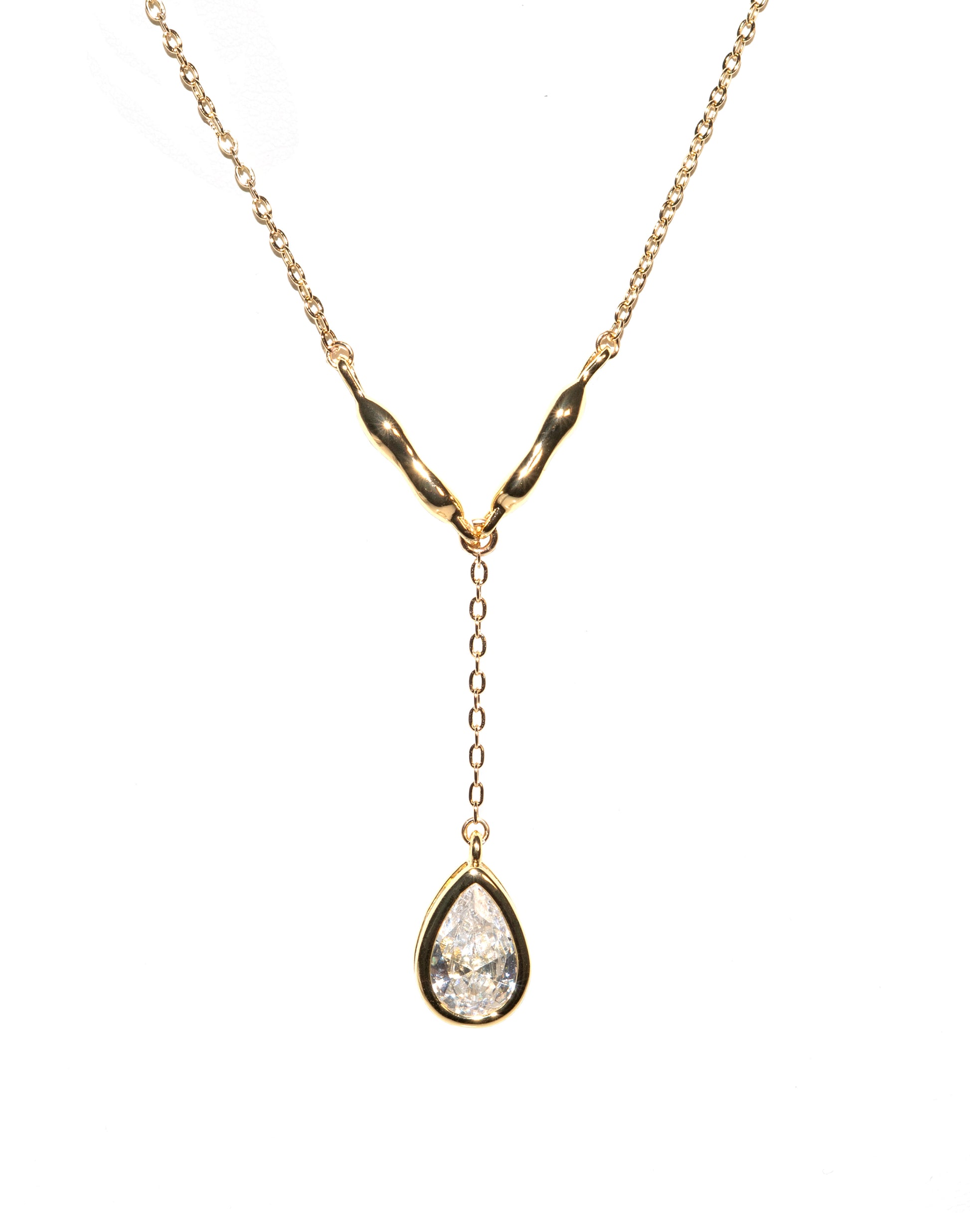 A refined evolution of the Suspendue silhouette, the Suspendue Goutte Necklace introduces a pear-cut cubic zirconia drop that catches the light with subtle brilliance. Sculptural gold-plated connectors flow into a 14k gold-filled chain that resists tarnishing, creating a piece that balances everyday wearability with elevated allure.