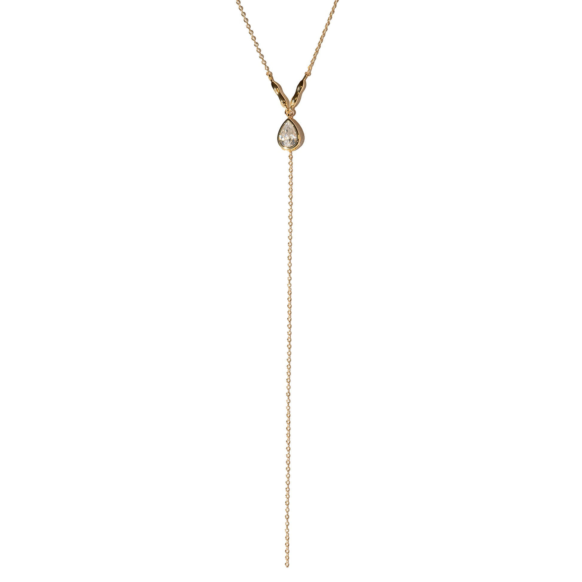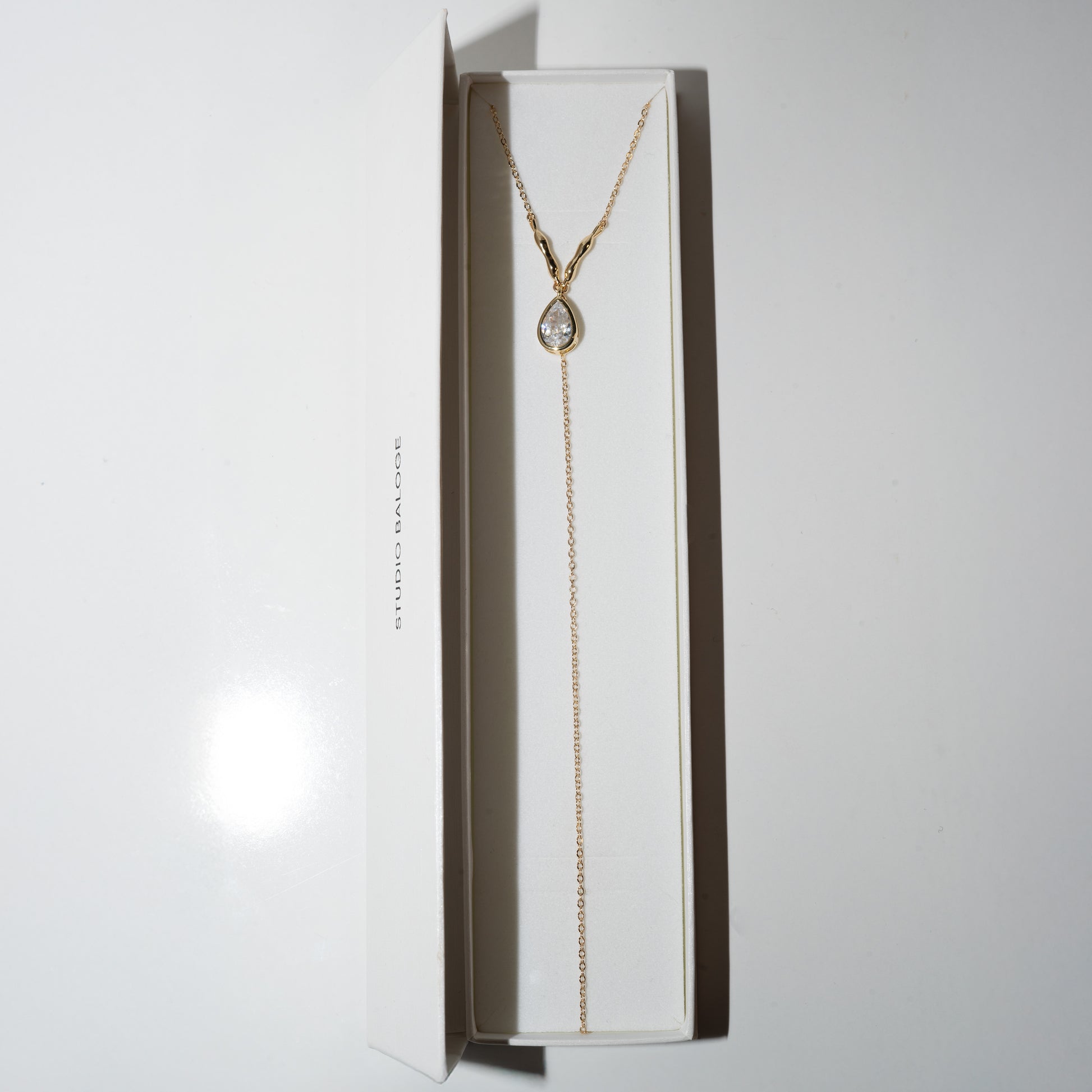 A continuation of the Épure story, the Épure Goutte Necklace captures the elegance of minimal design with a molten edge. Sculptural gold-plated connectors lead into a luminous pear-cut cubic zirconia drop, suspended from a 14k gold-filled chain that resists tarnishing. Designed to elongate the neckline, its fluid drop flows with the body, evoking the purity and brilliance of water in motion.