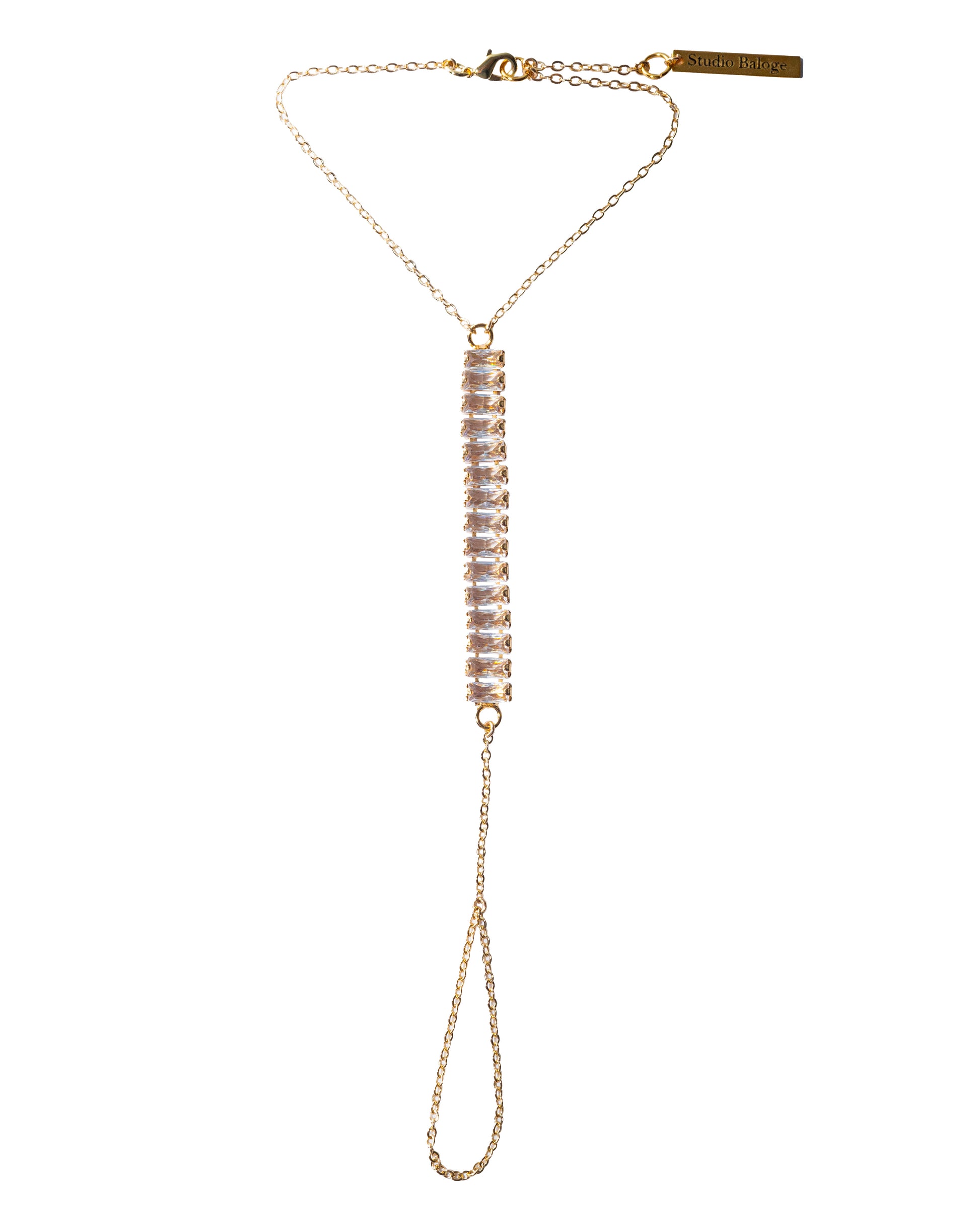 Gesture is a crystal hand harness designed to trace intention. A vertical bar of handset stones rests at the top of the hand, suspended between delicate gold-filled chains that wrap the wrist and loop the finger. Feminine, minimal, and softly assertive—it frames each move in quiet tension.
