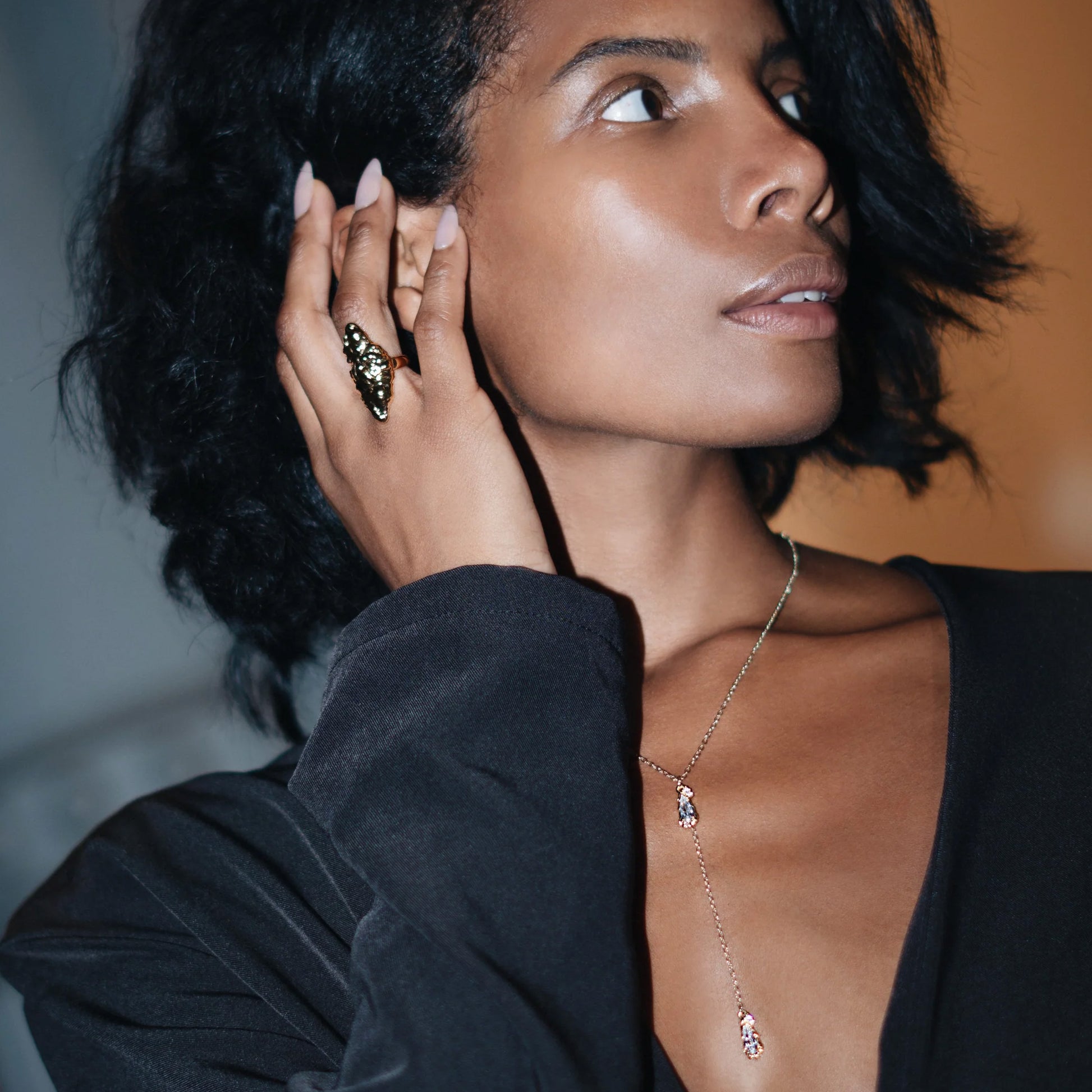 The Irida Ring is a sculptural statement inspired by organic movement and molten form. Its fluid surface reflects light in shifting textures, creating a bold yet wearable silhouette. Designed to span the finger with intention, this ring balances strength with elegance—striking in presence without excess weight. Each piece is individually finished, making every ring subtly unique.