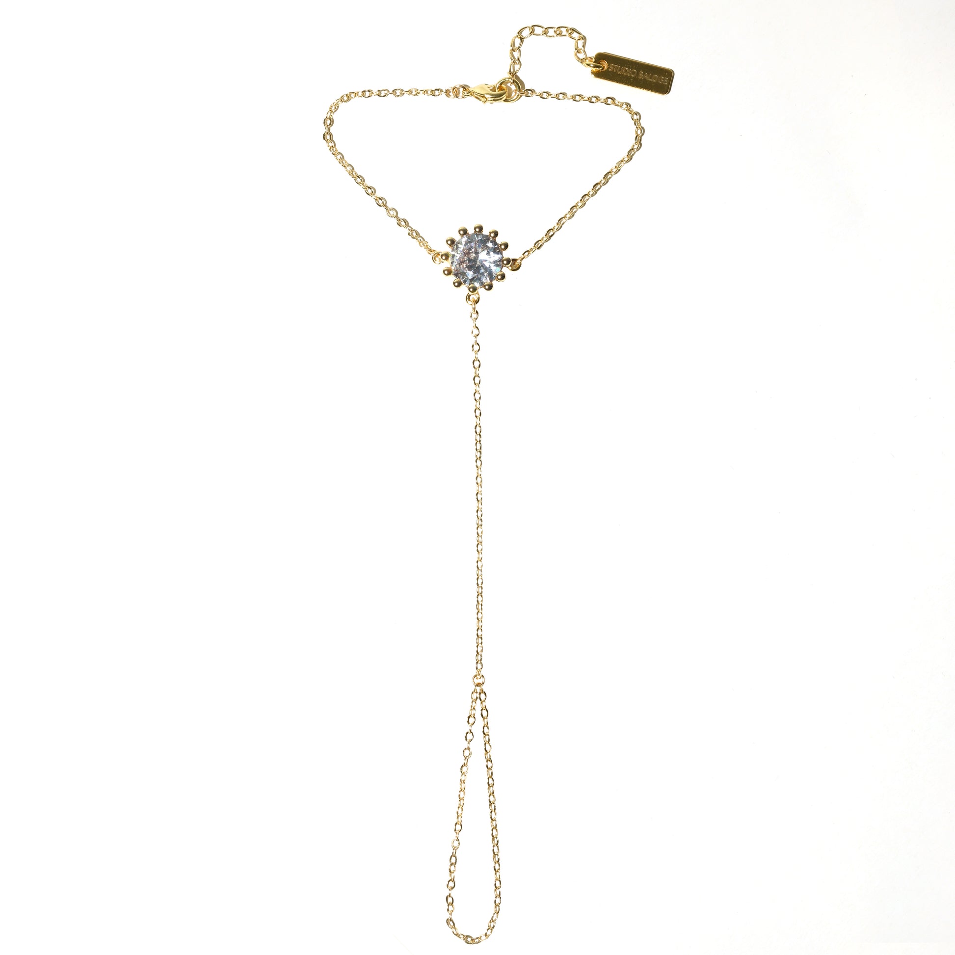 Noma Hand Harness is crafted in 14k gold-filled chain and centered by a luminous round crystal set in a delicate halo setting. The vertical drop extends gracefully along the hand, creating a refined silhouette that catches the light with every movement.