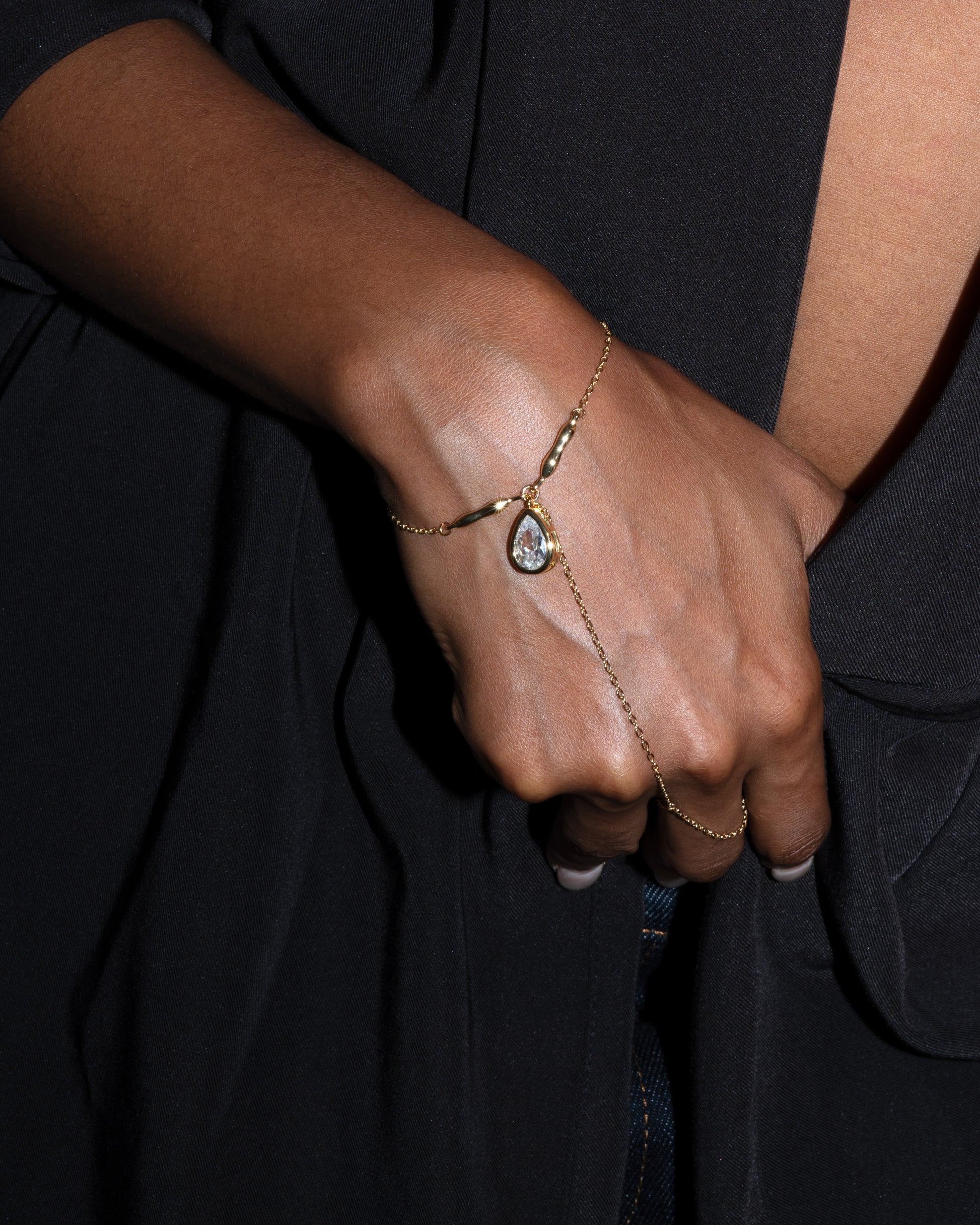 A luminous evolution of the Suspendue silhouette, the Suspendue Goutte Hand Harness introduces a pear-cut cubic zirconia drop suspended from sculptural gold-plated connectors. Draped across the hand, the 14k gold-filled chain resists tarnishing while adding fluid brilliance. Both delicate and commanding, it’s a piece designed for women who move differently — subtle in line, striking in detail.