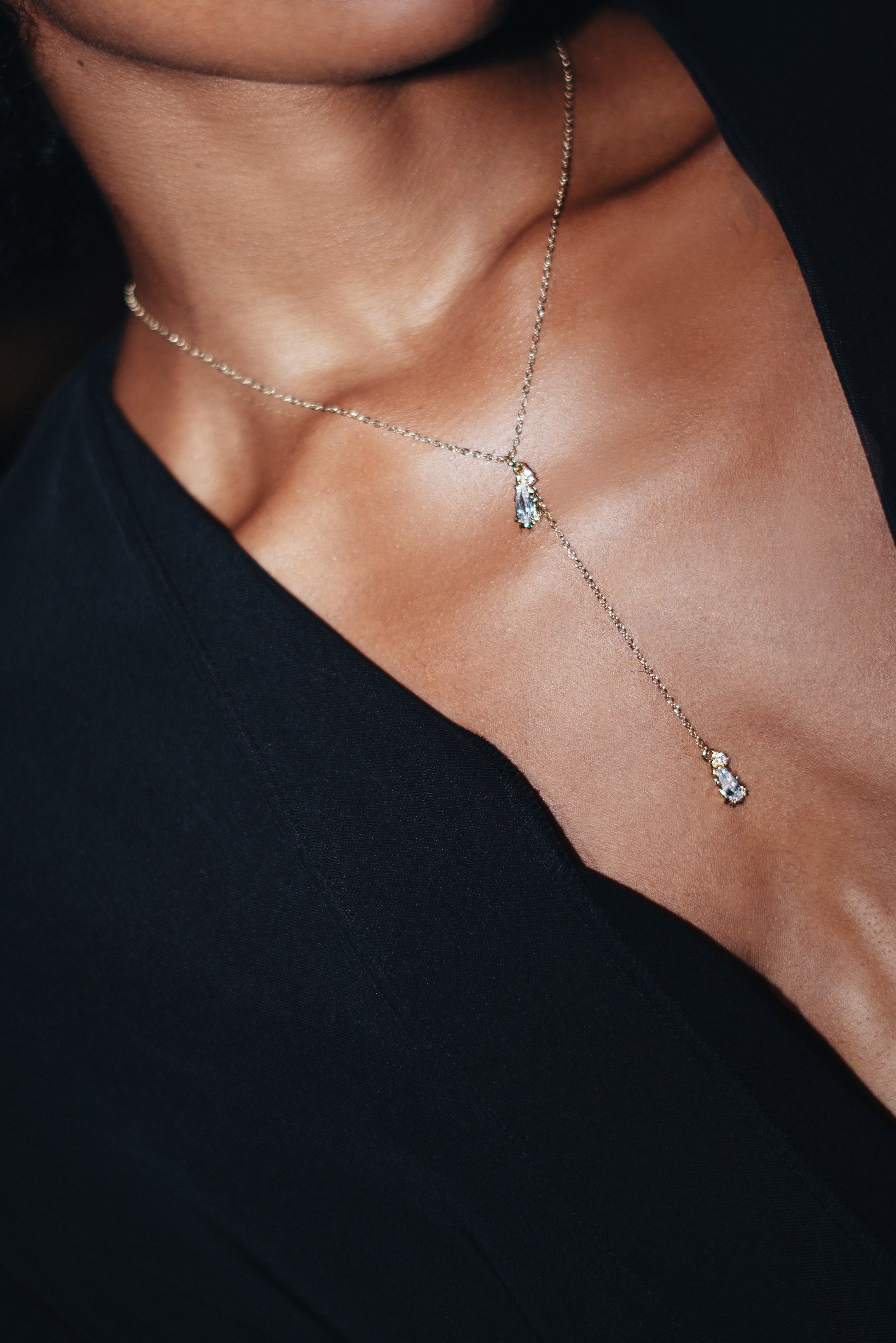 The Ysra Drop Necklace is designed to grace the skin with quiet sensuality. Featuring two crystal-cut pendants suspended in vertical alignment, this piece draws attention with its understated elegance.